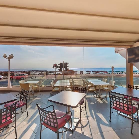 Great view. Right next to the sea. Staff are very friendly and helpful. Everyone speaks English and Greek. Hotel is neat, but could use some renovation in the restaurant. Breakfast is very local, with not much choices (1 kind of cheese, 2 kinds of turkey, toast, eggs, butter and coffee/tea). Make sure to book a high floor room so that you can see the sea in front of you. The view is nice in the morning. Very close to Larnaca International Airport. 10 minutes by taxi. 15 mins by bus. Taxi costs 15 euros from the airport. No idea about the bus, but probably around 2 euros. Reception available 24/7. They also have a huge restaurant and a bar. There's also a gym which is very close. And the hotel is 20 minutes walking from the centre of the town.